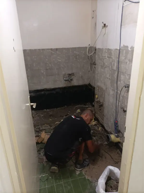 - Demontaža stare sanitarije i keramike – rušenje stare metalne duboke kade, stojećeg lavaboa, stare wc šolje i rušenje pločica