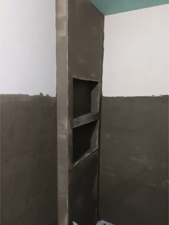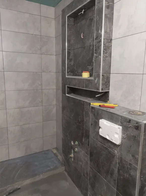 3. Zidanje baze za ugradni vodokotlić sa tipkom i oblaganje vodokotlića pločicama. - Postavljanje keramičkih pločica, oblaganje zidanih elemenata pločicama i ukrasnim lajsnama
