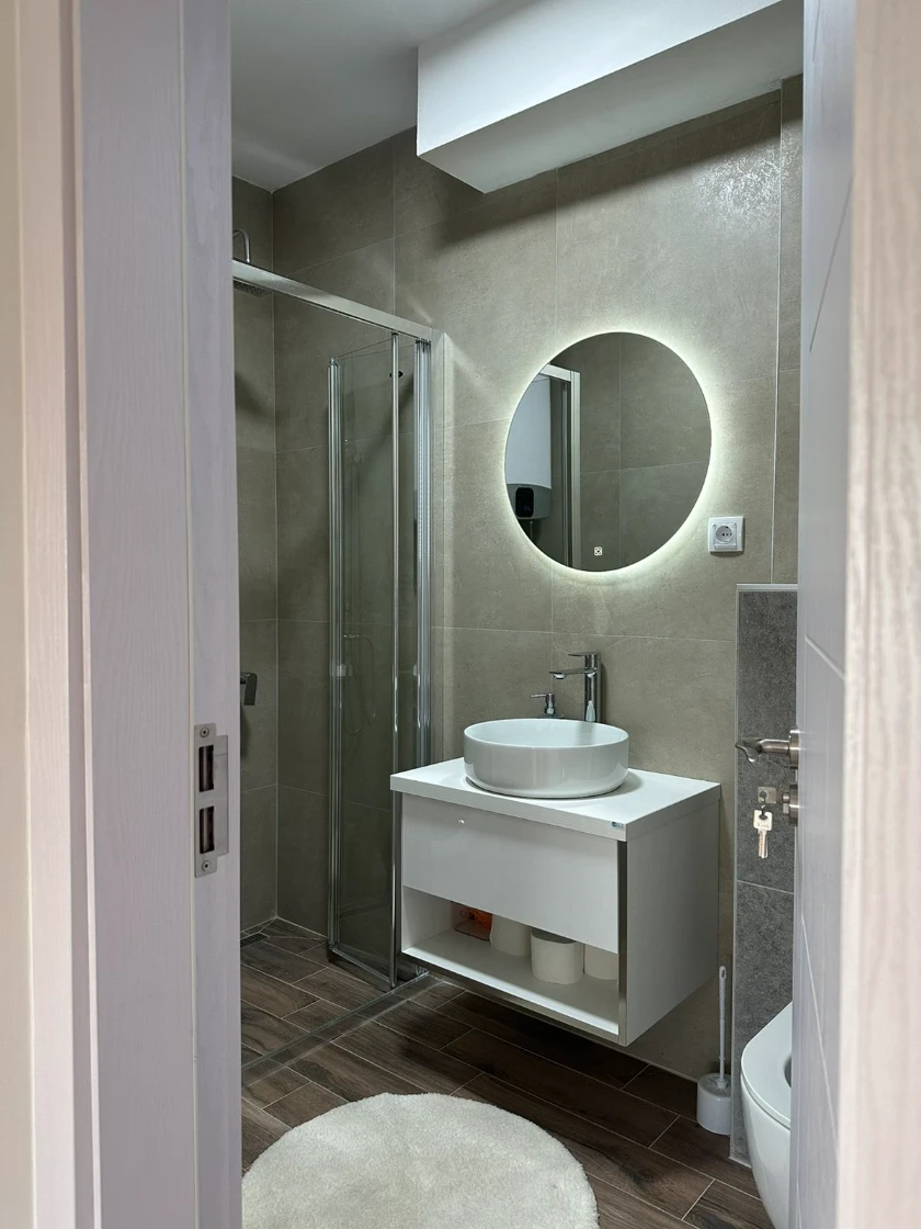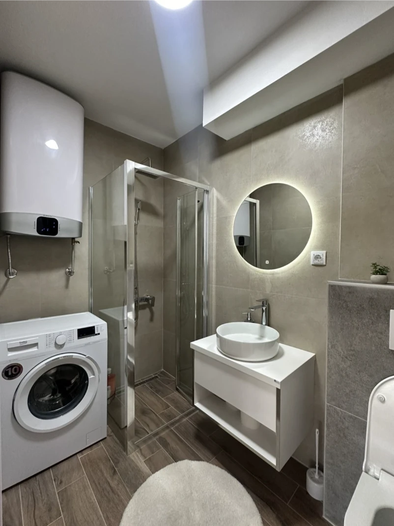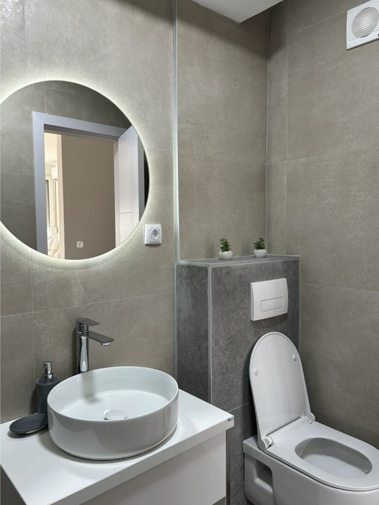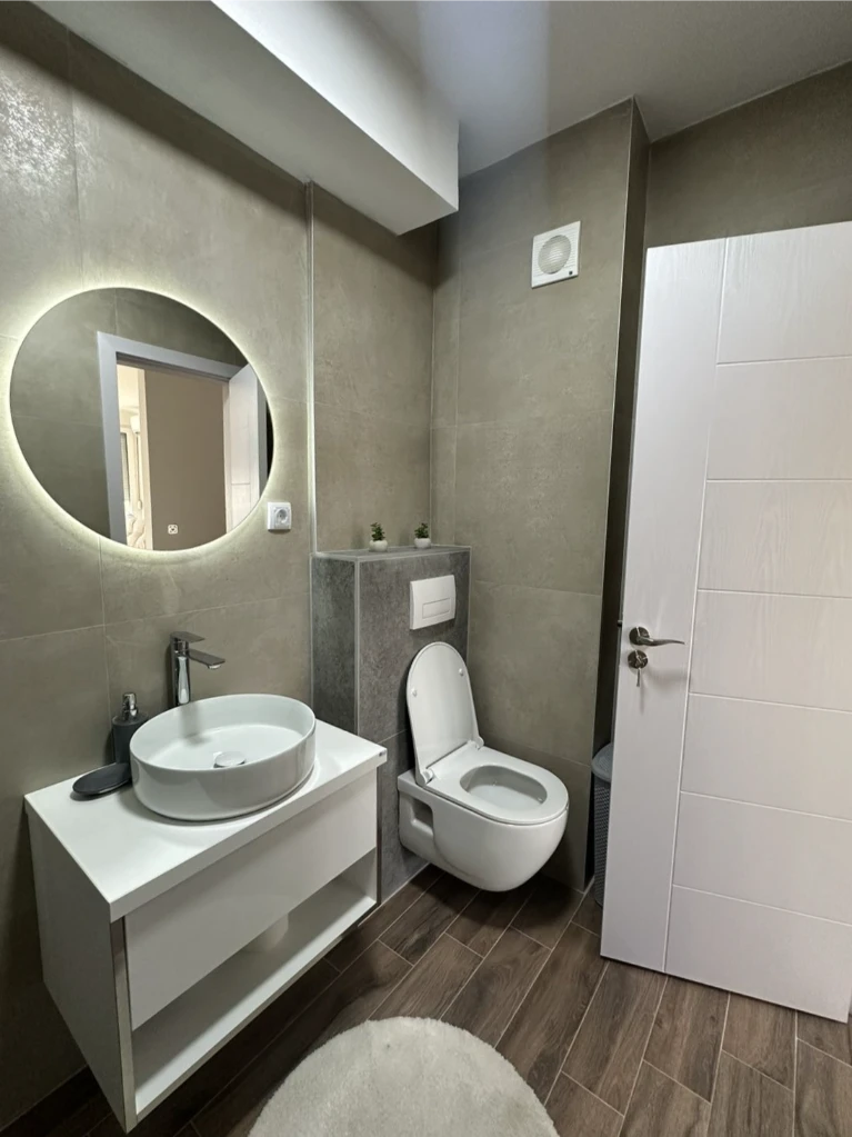 Kompletno završeno renoviranje kupatila, potpuno iskorišćen sav prostor. Na plafonu se ovde lepo vidi dužna gipsana konstrukcija koja sakriva stare cevi.