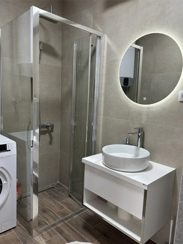 - Postavljanje tuša: U pitanju je usponski tuš (tzv. ruža ili kiša) sa glavom tuša koji obezbeđuje bogat i širok mlaz. Tuš kabina sa staklima koja imaju prelamanje kao harmonika vrata (cik-cak).